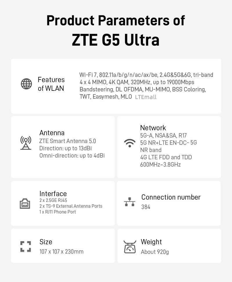 Key Features of the ZTE G5 Ultra Wi-Fi 7 5G FWA (MC8531)